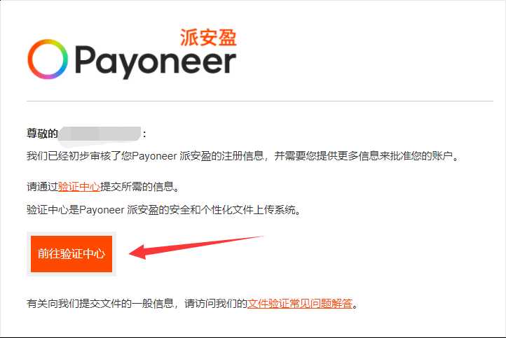 紧接着,你的邮箱会收到另一封邮件,告诉你已经初步审核了你的 Payoneer 派安盈注册信息,并需要你提供更多信息来批准你的账户,需要你点击前往验证中心。