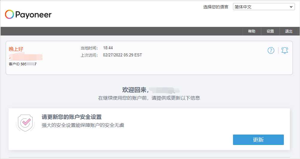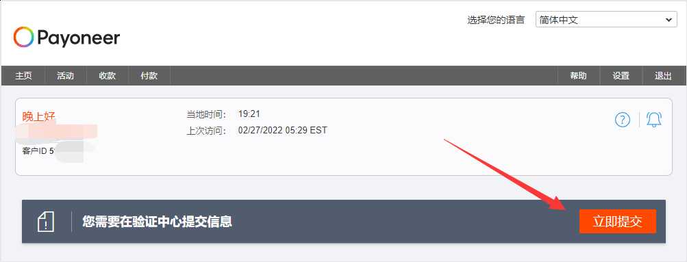第7步:成功注册开通派安盈Payoneer帐户