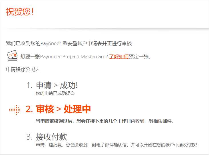 提交成功之后,你会看到 Payoneer 的说明:我们已收到您的资料,一旦您的账户已批准,您将收到邮件通知。