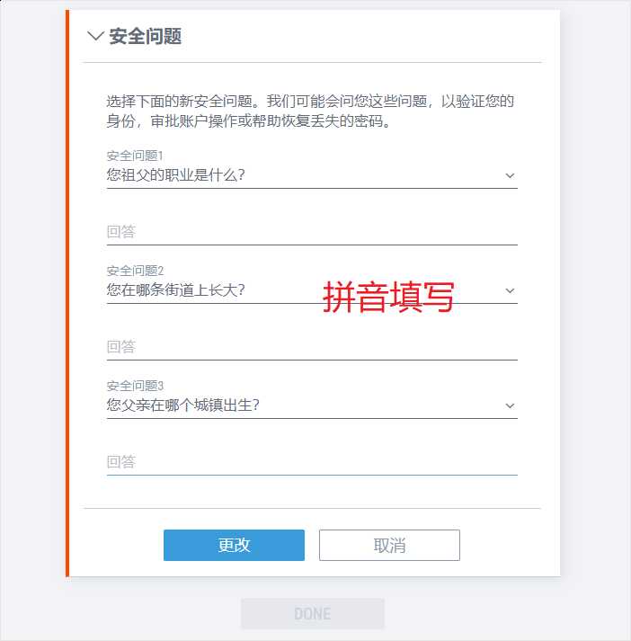 - 选择一个安全问题并输入答案。记下这个问题并保存在某处。当您忘记密码时需要此信息。
