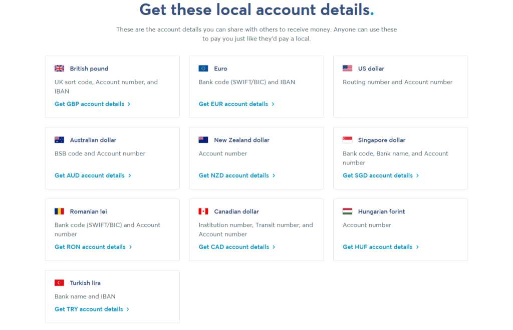 Wise注册成功后,可以得到以下10个虚拟银行账户。