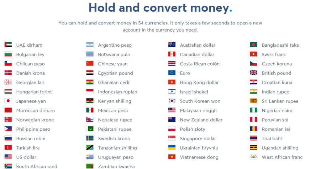 你可以持有以下并相互转换成以下54个国家的货币,如需出金,需要在对应国家有相应的银行账户!