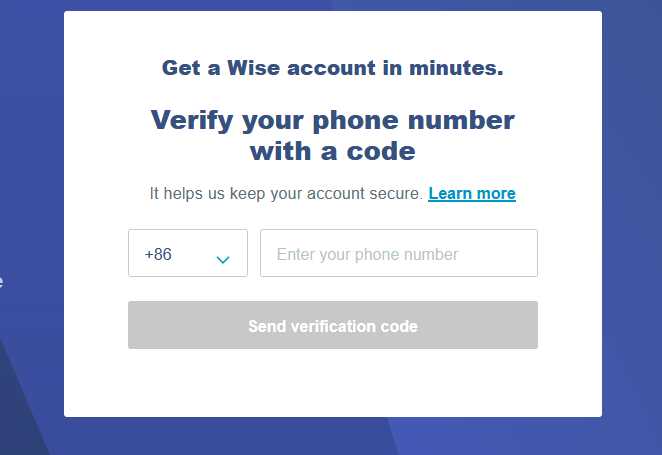 Wise支持中国大陆电话号码激活,输入自己的电话号码即可。然后点击“send verification code”,手机会受到验证码,我们输入收到的验证码,然后点继续。
