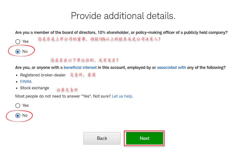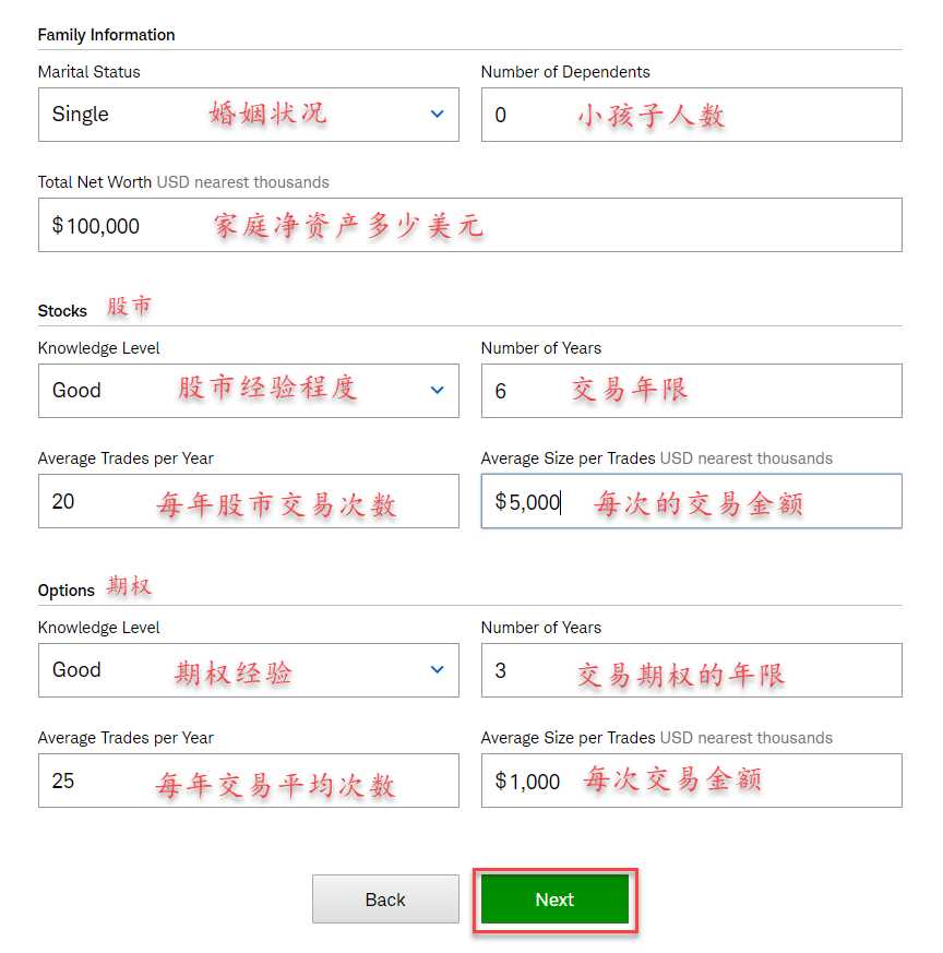 上面勾选期权交易(Options Trading)的话,下面是选择期权的等级,家庭状况,还有你对股票和期权的交易经验,交易年限。