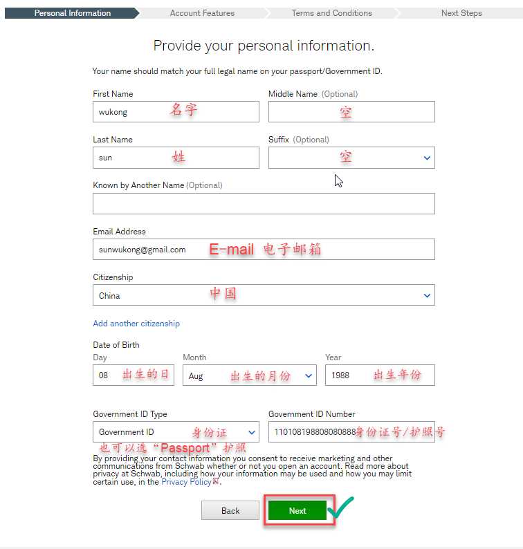 填写个人资料。在这里可以选择你的证件类型(如下图底部,Passport护照或者Goverment ID身份证)