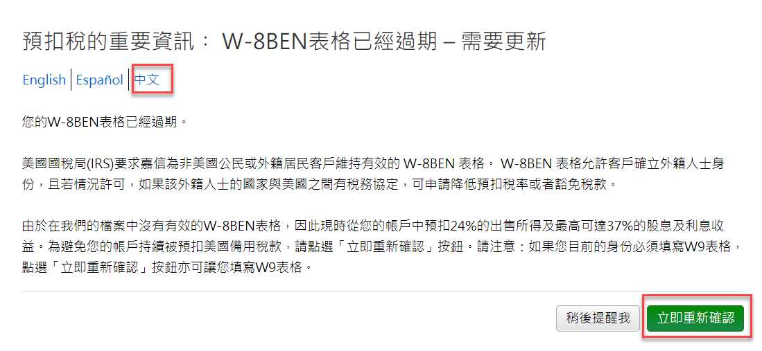 【填写W-8BEN申报表】,终于看到中文了,点击中文,只有中文繁体,没有简体字。然后点下「立即重新確認」